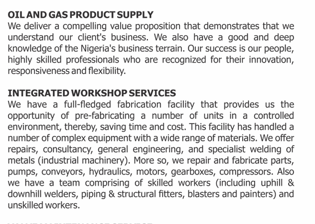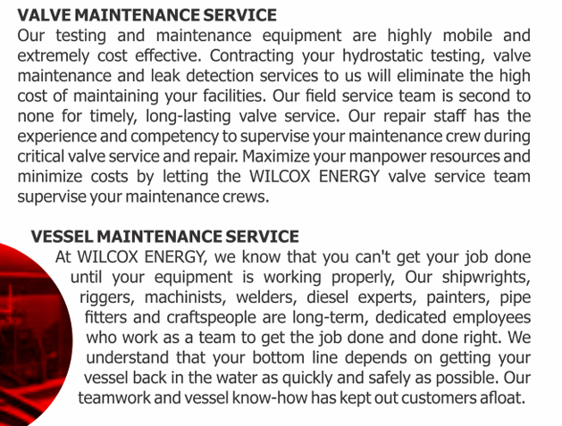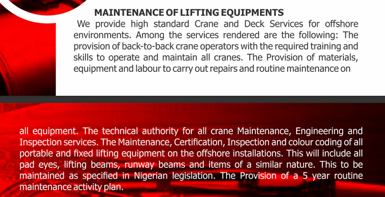 Welding and Fabrication, Sandblasting and Painting, NDT, Pressure Testing, Fire Panel Maintenance and Installation, Waste Management, Industrial Cleaning, Trucking Services